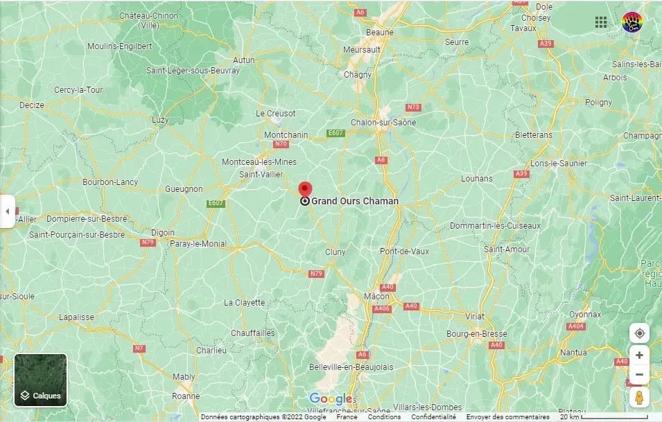 Grand Ours Chaman à Saint Martin la Patrouille se situe à: 20 mn de Cluny, 25 mn de Montceau les Mines, 40 mn de Mâcon, 40 mn de Chalon sur Saône, 40 mn de Tournus, 40 mn de Paray le Monial, 1h05 de Bourg en Bresse, 1h20 de Dijon, et 1h25 de Lyon.