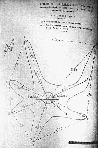 Les mesures de l'empreinte, et le détail des trous en particulier, montrent incontestablement des marques d'une rare elaboration. Enfin, dans le cas de Marliens, un engin non identifiié avait bien été relevé par le radar militaire de creil, et l'étude du sol, sous les traces de l'OVNI, révèle la présence d'une poudre mauve. L'analyse ultérieure établira qu'il s'agit de cristaux de silice ayant subi un début de fusion à 1500°C minimum.